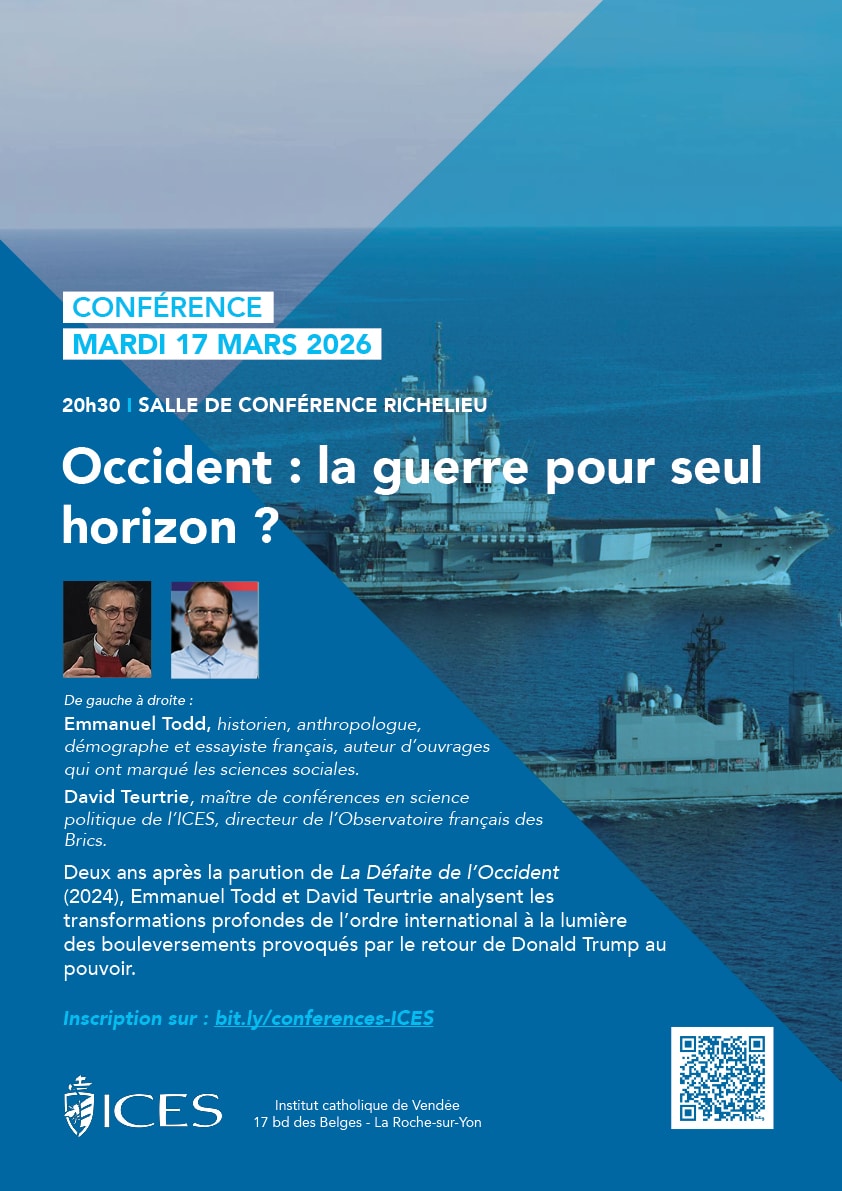 À l'heure où les équilibres géopolitiques mondiaux connaissant une accélération sans précédent, l'ICES, Institut catholique de Vendée se place au cœur du débat intellectuel contemporain. Le mardi 17 mars 2026, l'établissement accueillera une conférence de haut niveau réunissant l'anthropologue Emmanuel Todd et politologue David Teurtrie. Deux ans après le retentissement de l'ouvrage La Défaite de l'Occident, cette rencontre exceptionnelle, proposent de décrypter les lignes de faille de l'ordre international à l'aune du retour de Donal Trump au pouvoir.