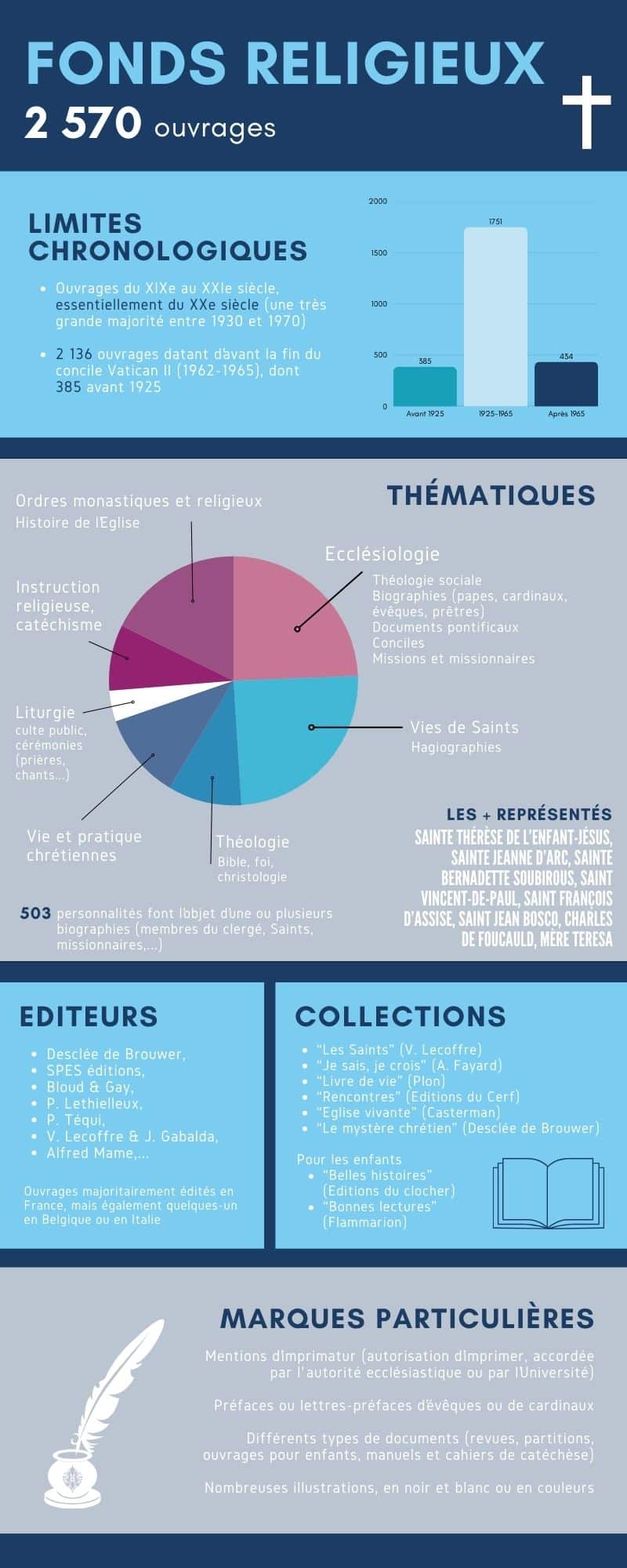 Plus de la moitié des ouvrages sont des biographies : 503 personnalités font l'objet d'une ou plusieurs biographies (membres du clergé, Saints, missionnaires).